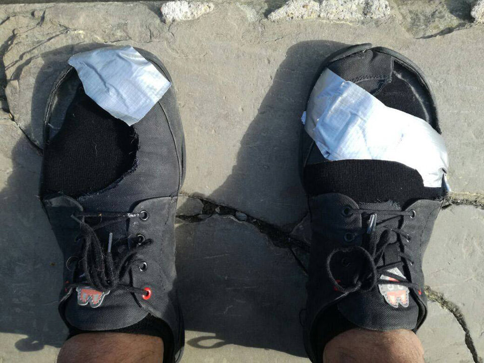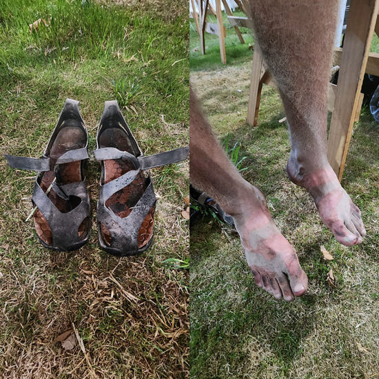Matthew McGregor from the Wildling Community, ran a 100-kilometer race in his Feather sandals. He earned himself the distinctive tan stripes.