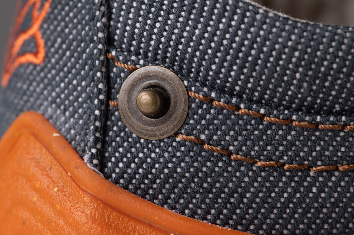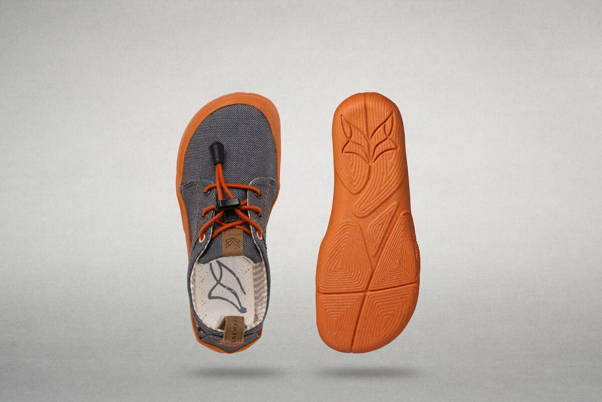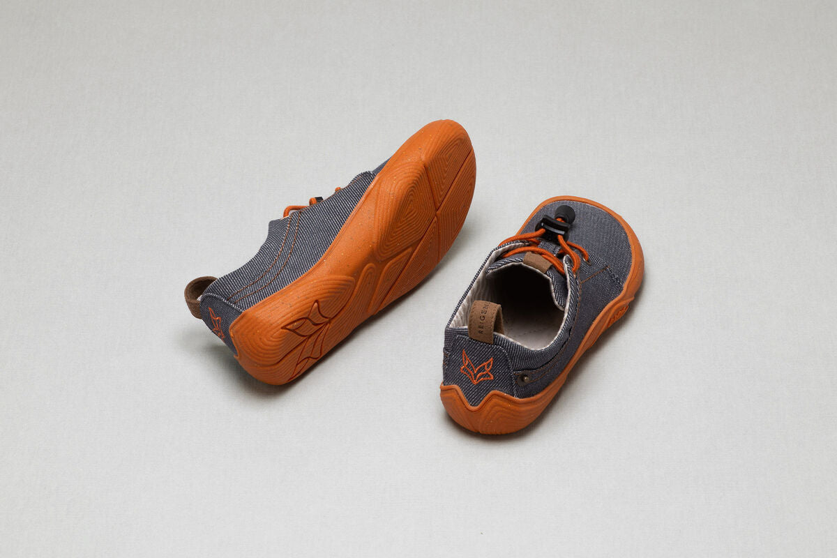 In the adult version, Arnow comes with flat, midnight blue laces with orange dots that complement its midnight blue sole. The children's version, on the other hand, is more playful: orange elastic laces and the cheerful orange outsole immediately put everyone in a good mood. The contrasting stitching and the rivet on the side add similarly colorful accents, harmoniously rounding off the denim look.